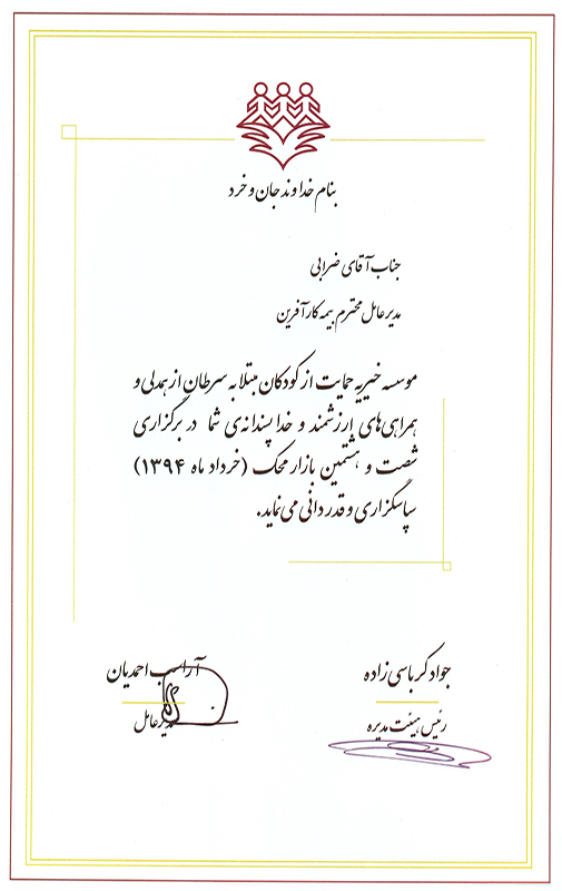هیات مدیره و مدیرعامل موسسه خیریه حمایت از کودکان مبتلا به سرطان (محک) طی نامه ای از حضور مسئولانه بیمه کارآفرین در شصت و هشتمین بازارچه خیره محک قدردانی نمود.
