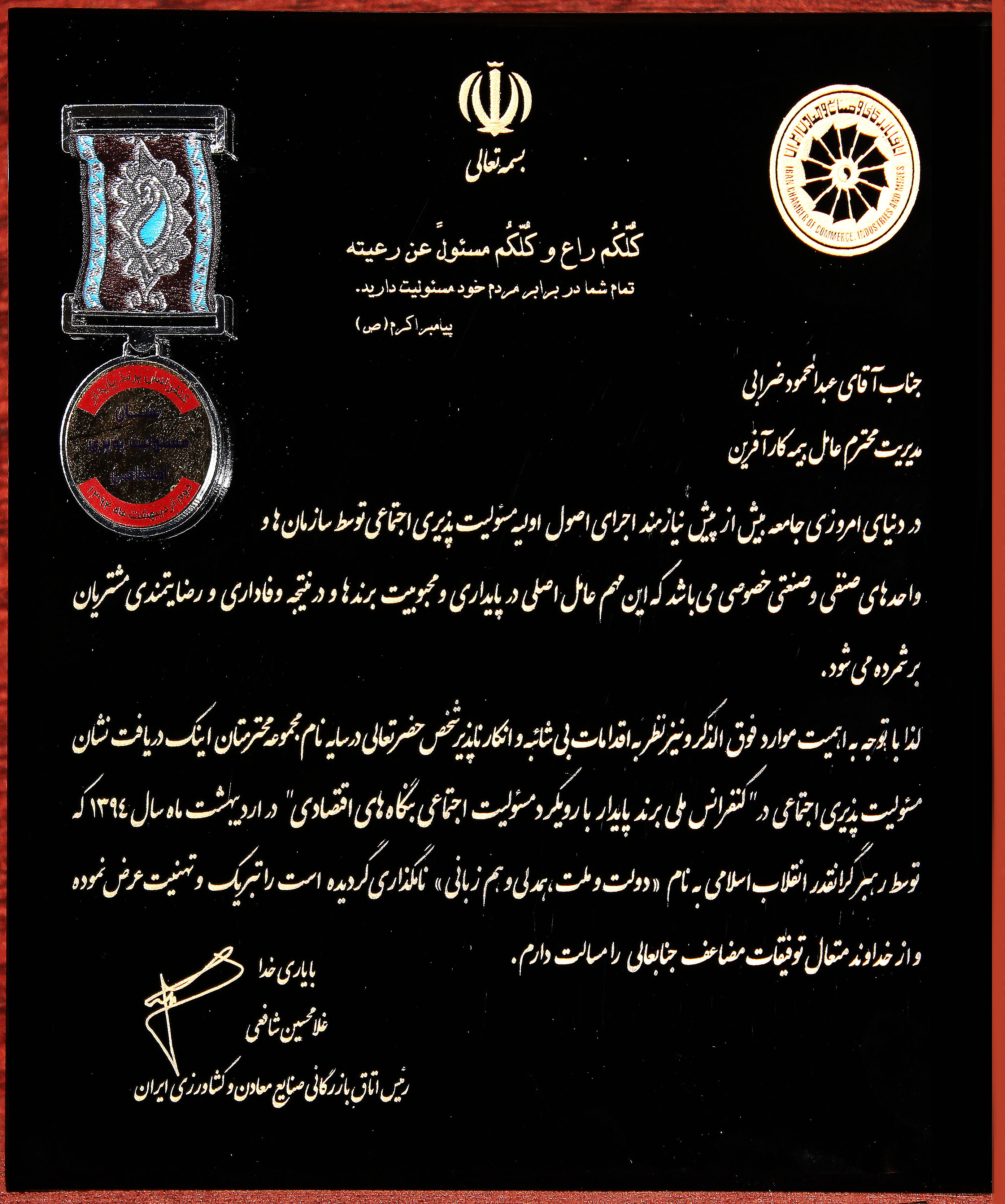 غلامحسین شافعی رئیس اتاق بازرگانی، صنایع، معادن و کشاورزی ایران در این لوح با توجه به اهمیت پایداری و محبوبیت برندها و رضایتمندی مشتریان بیمه کارآفرین را سزاوار دریافت این نشان دانسته است.
