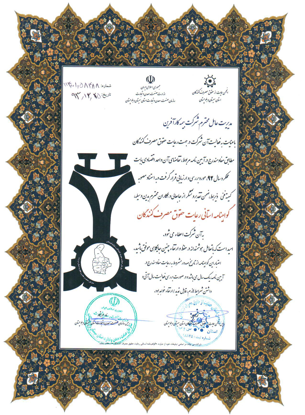 بیمه کارآفرین شعبه زاهدان به عنوان واحد برتر استان سیستان و بلوچستان در رعایت حقوق مصرف کنندگان برگزیده شد.