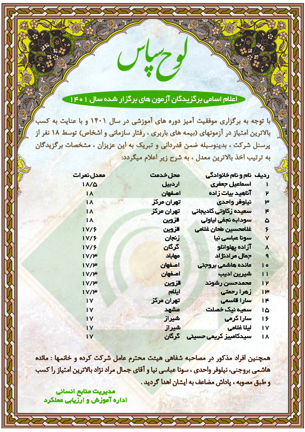 با توجه به برگزاری موفقیت آمیز دوره های آموزشی در سال 1401 و با عنایت به کسب بالاترین امتیاز در آزمون های رشته های مختلف (بیمه های باربری، رفتار سازمانی و اشخاص) توسط 18 نفر از پرسنل شرکت، بدینوسیله ضمن قدردانی و تبریک به این عزیزان، مشخصات برگزیدگان به ترتیب اخذ بالاترین معدل، به شرح زیر اعلام می گردد: